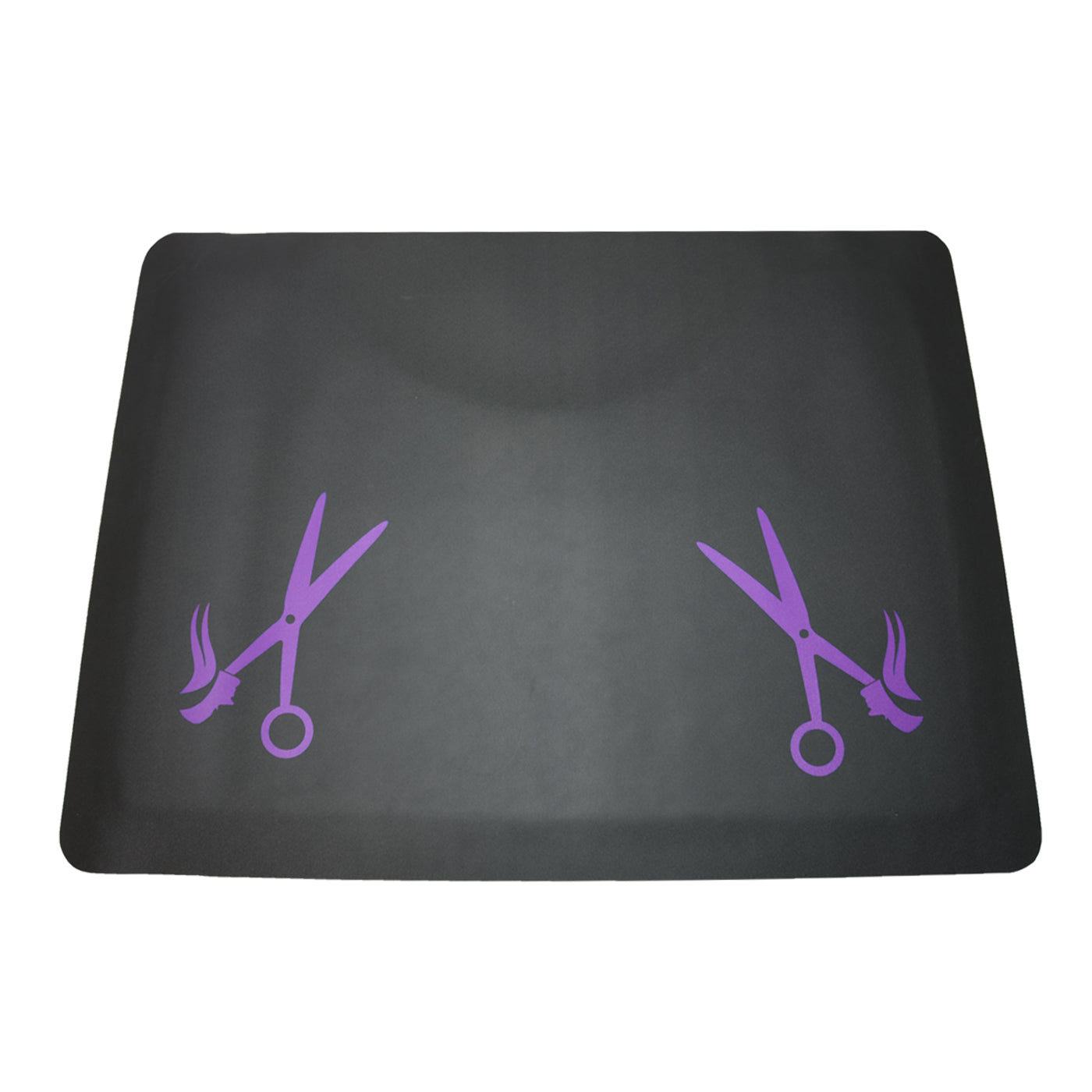 | Our black rectangle mats will enable you to work long hours without the stress on your joints and fatigue that comes with working extended periods on your feet. The mats also have a classy grey or red silkscreened stylized salon shears with flowing hair design. These mats were produced to make them the optimal size for use in salons with the industry standard spacing between work stations of 4.5'.