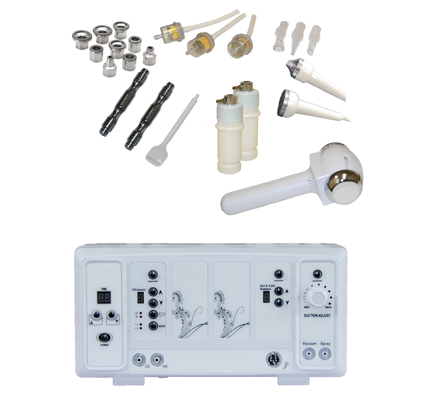Our Microdermabrasion comes with two different interchangeable toolsets (traditional, and a new patented solid-core double-tipped wand with skin tightening vacuum wand), so you can use whichever protocol you wish for your client’s treatments.